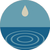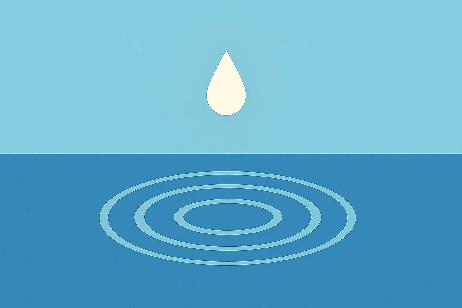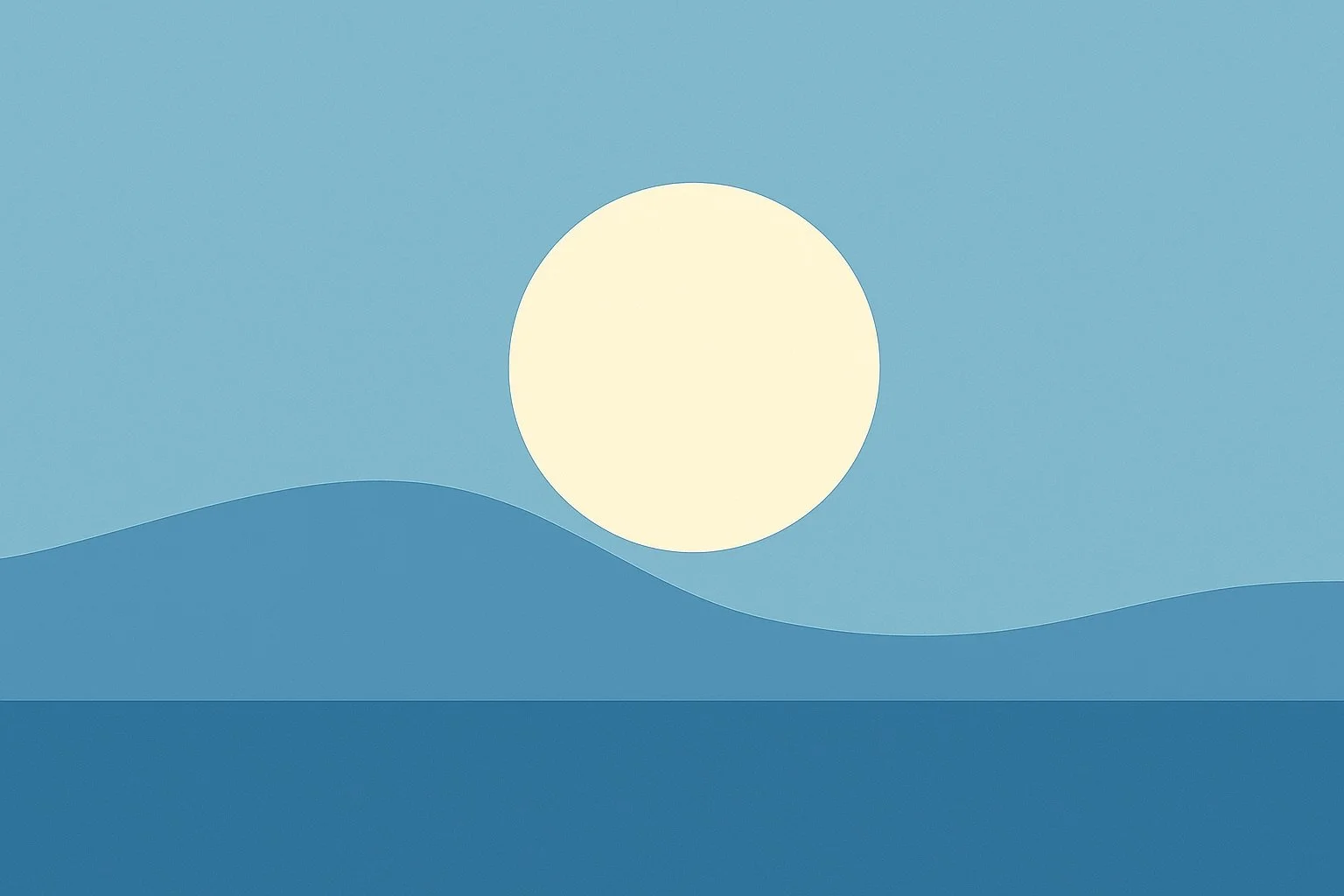 Minimalist illustration of the sun setting or rising over ocean waves with a blue sky.